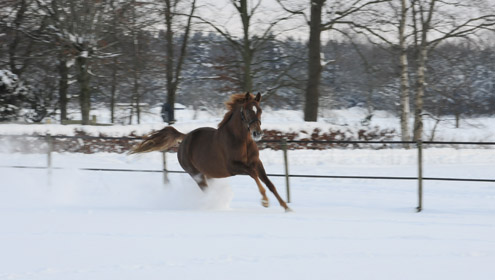 In Nederland hebben we geen echt woord voor Beschäler. Misschien komt vaderdier het meest in de buurt? Dat is wel meteen waar je aan denkt als je deze jonge hengst ziet. Bij Sprehe zal Eichenkönig zijn genen niet alleen aan Trakehner merries gaan doorgeven.
