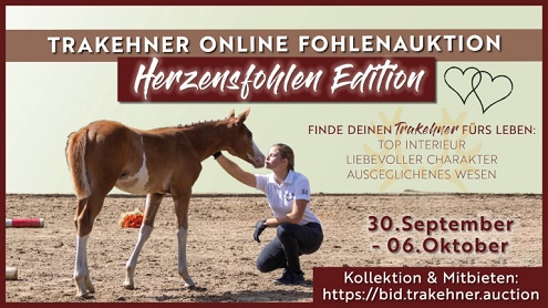 Op dit moment is er een Trakehner Online veulenveiling. Geweldige Trakehner veulens, zorgvuldig geselecteerd door de commissie om hun afstamming, hun exterieur en hun toekomstverwachting. Een uitgelezen kans om uw droomveulen aan te schaffen! Al vele veulens uit veilingen als deze zijn later goedgekeurde hengsten of geweldige sport/ fok paarden geworden. Wacht niet te lang want de veiling eindigt op 6 oktober.