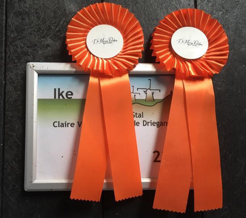 Claire had behalve Ike nog een paard mee naar Nieuw Vennep en er werd begonnen met de Z dus die was al vroeg op om te vlechten en alles voor te bereiden. Het was koud in Noord Holland, en de baan was verre van ideaal, los rijden was amper mogelijk. Maar Ike deed zijn best ondanks een wat korte voorbereiding. Hij haalde behalve twee oranje linten óók twee winstpunten, dat gaat heel goed!