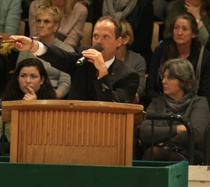 Al sinds 34 jaar wordt de veilinghamer gehanteerd door Uwe Heckmann. Een man met invloed, een scherp oog en met overwicht over zijn publiek. Hij kan met een heel klein gebaar of geluidje een hele hal muisstil laten worden. Hij is met recht een veiling meester! In Hannover tijdens het afgelopen Bundesturnier waar hij ook altijd de veulenveiling leidt, was meneer Heckmann al te zien met een mitella om een arm omdat hij gebleseerd was. Hij heeft toen na een lange pauze de veulens geveild. Nu op de veiling van Neumünster heeft hij voor het eerst in 34 jaar verstek moeten laten gaan i.v.m. ziekte.