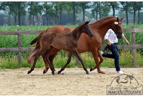 En het moet even gezegd worden, wat een indrukwekkende merrie dat is! Hanna is een Imperio dochter, volle zus van de hengst Hancock. Een geweldige merrie, niet één waar je van verwacht dat ze draagmoeder is maar ze doet die rol fantastisch. Het veulen is even ziek geweest en is daardoor een klein beetje achter gebleven in ontwikkeling maar ze zal dat snel inhalen. Nu nog is ze overbouwd maar ze toont al wel een heel sportief perspectief. Ze is modern en beschikt over mooie ruime lijnen.