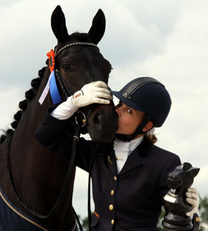 De Kasparow trofee én de Anky clinic gingen naar Aniek Schraa die voor Bouquet Trakehners de 4 jarige Kasparow dochter Dühnja rijdt. Het was een spannende strijd want tijdens de selectiewedstrijden waren er een aantal ruiters die heel goed gepresteerd hebben. Het kwam dus echt op de finale aan. St.Pr.u Pr.St.Dühnja liep twee goede proeven vandaag die ondanks de wind vrijwel storingsvrij werden afgelegd. Duhnja liep ondanks haar prille leeftijd, ze is nog maar net 4, twee goeie proeven met veel balans en overzicht. Bouquet Trakehners fokte uit hun Guter Planet dochter, Donna Karina deze donkerbruine chique Kasparowmerrie. Vorig jaar werd ze voorbereid voor stamboekopname en stutenleistung wat ze allemaal met succes gedaan heeft. Zo is Dühnja nu Premie en Staatspremie merrie geworden. Aniek, die niet eerder een Trakehner heeft gereden is volgens eigen woorden “om”, als alle Trakehners zo zijn dan wil ik nooit meer andere paarden!